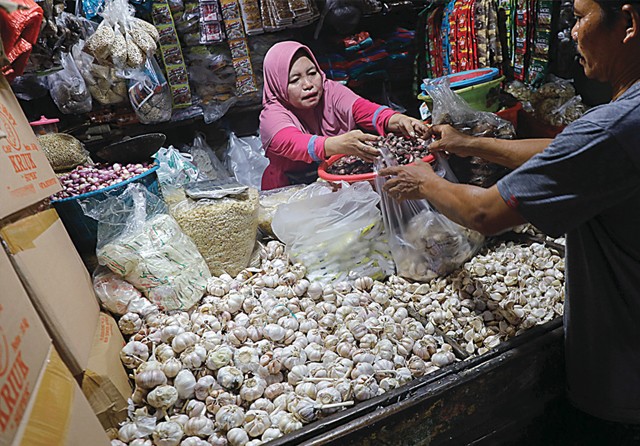JUMLAH PEMBELI MENURUN: Riamah, pedagang Pasar Keputran, melayani pembeli bawang putih. (Dipta Wahyu/Jawa Pos)
