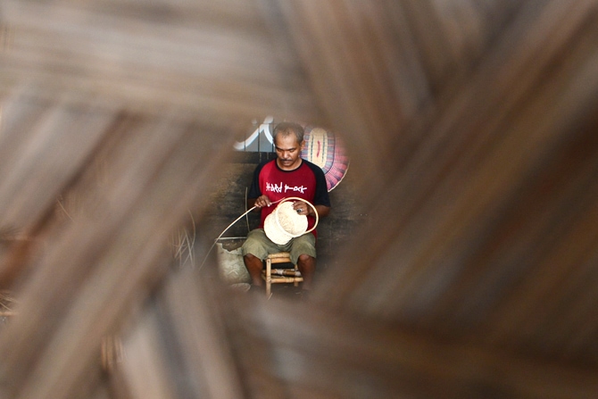 Pengerajin anyaman rotan menyelesaikan pembuatan keranjang di jalan raya Pasar Minggu, Jakarta, Sabtu (6/3/2021). Pandemi Covid-19 menurunkan banyak sektor usaha tak terkecuali usaha mikro kecil menengah (UMKM) akibat adanya pembatasan aktifitas masyaraka