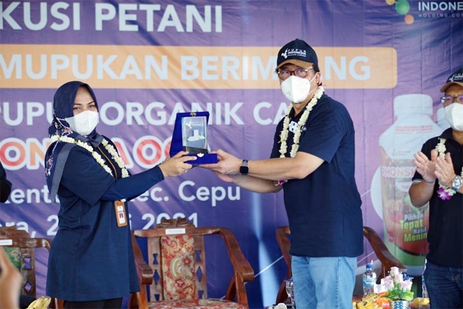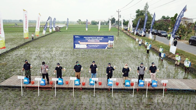 Direktur Produksi Pupuk Indonesia, Bob Indiarto bersama Wakil Bupati Blora, Tri Yuli Setyowati menggelar demonstration plot (demplot) tanaman padi dengan aplikasi pupuk organik cair Phonska Oca di Desa Kentong, Kecamatan Cepu, Kabupaten Blora, Jawa Tengah