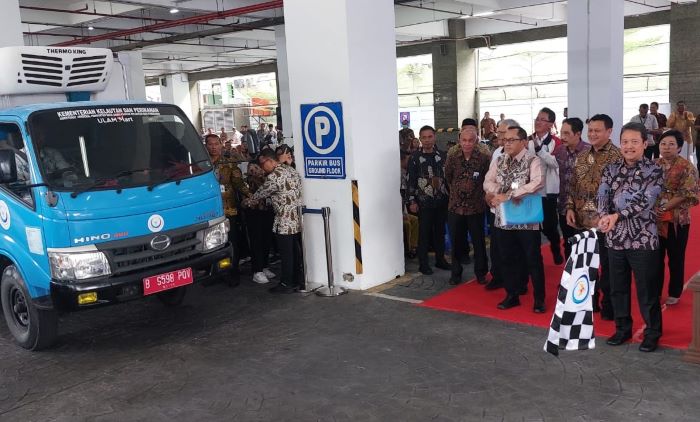 Menteri KKP Trenggono melepas truk pembawa bantuan paket ikan di Gedung Mina Bahari III, Jakarta Pusat, Jumat (29/12).