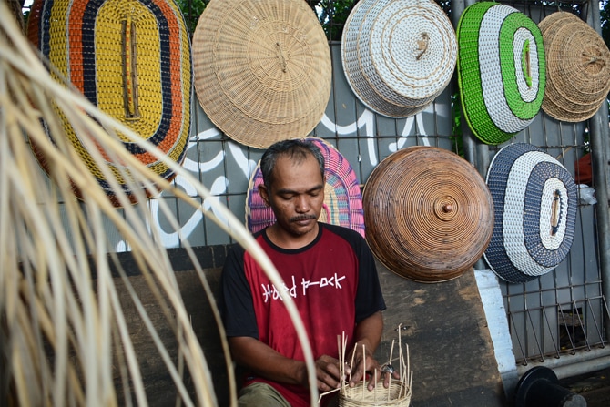 Pengerajin anyaman rotan menyelesaikan pembuatan keranjang di jalan raya Pasar Minggu, Jakarta, Sabtu (6/3/2021). Pandemi Covid-19 menurunkan banyak sektor usaha tak terkecuali usaha mikro kecil menengah (UMKM) akibat adanya pembatasan aktifitas masyaraka