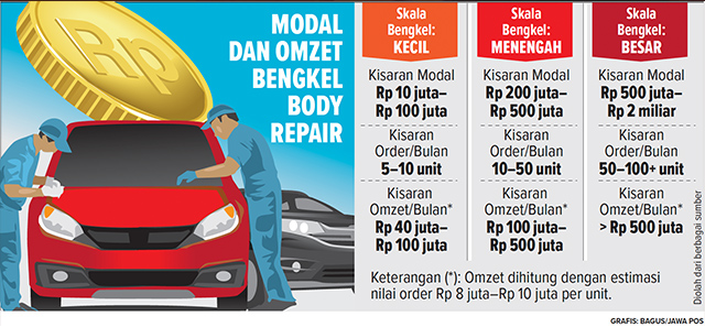 Bagaimana potensi omzet? Tomy membeberkan bahwa bengkel yang dimilikinya berskala kecil yang hanya muat enam mobil. Jasa perbaikan dan pengecatan full body berkisar Rp 6 juta–Rp 8 juta bergantung ukuran mobil. Bengkel juga menawarkan perbaikan ringan atau biasa disebut per panel dengan harga mulai Rp 300 hingga Rp 500 per panel atau bisa lebih. Merujuk ukuran yang perlu diperbaiki.