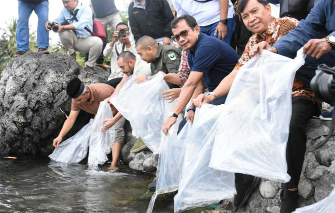 Direktur Utama SIG, Donny Arsal (berkacamata) melepas ikan bilih di Danau Singkarak, Sumatra Barat.