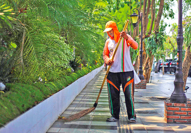 TETAP KERJA: Petugas outsourcing Pemkot Surabaya sedang membersihkan trotoar. Ada rencana pemotongan gaji Rp 700 ribu. (Dite Surendra/Jawa Pos)