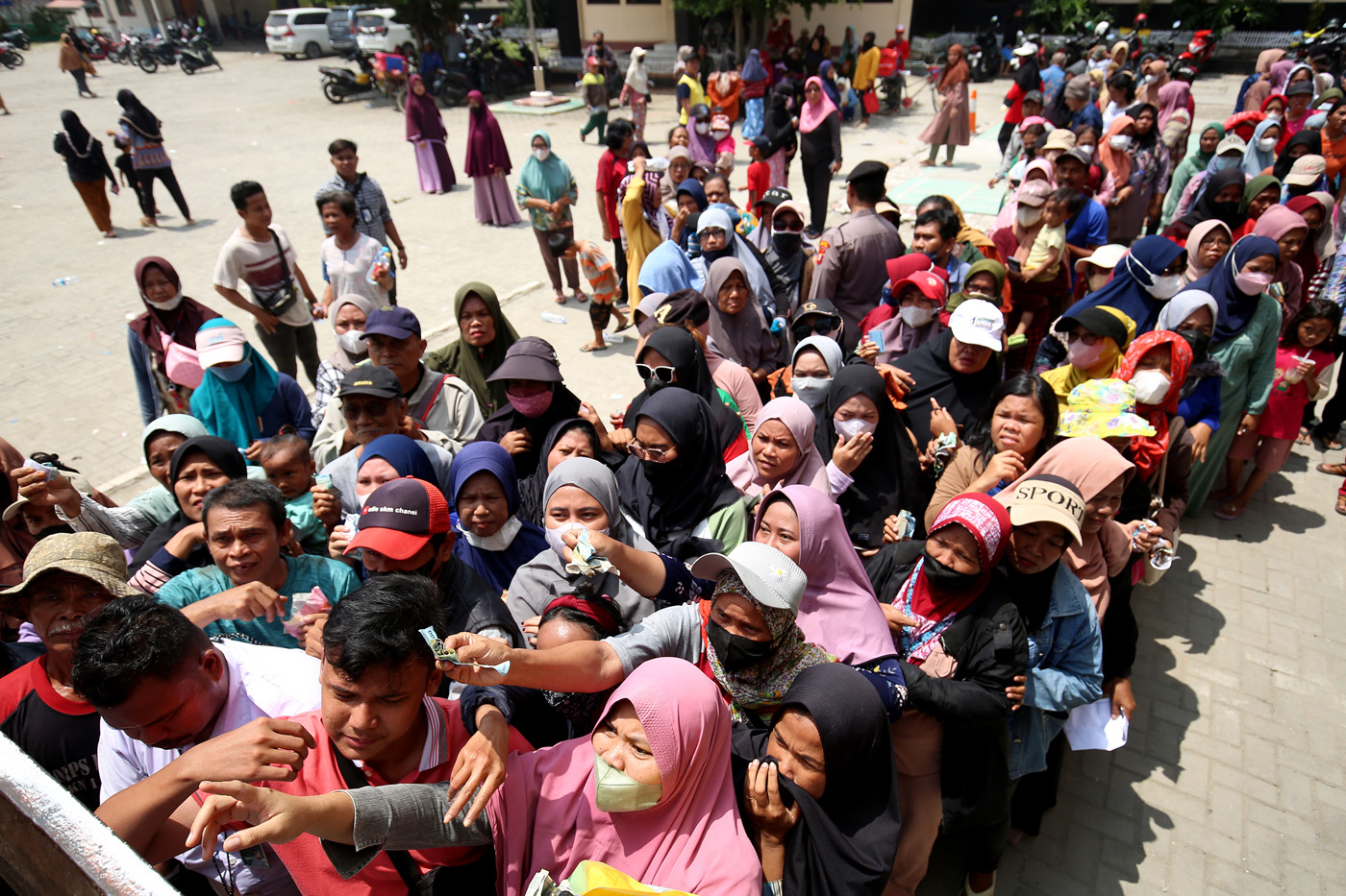 Sejumlah warga yang tidak mendapatkan kupon tetap antre untuk mendapatkan beras Stabilisasi Pasokan dan Harga Pangan (SPHP) di Kantor Kecamatan Babelan, Kabupaten Bekasi, Jawa Barat, Selasa (20/2/2024).