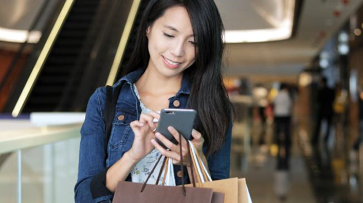 Ilustrasi wanita muda melakukan transaksi belanja menggunakan handphone