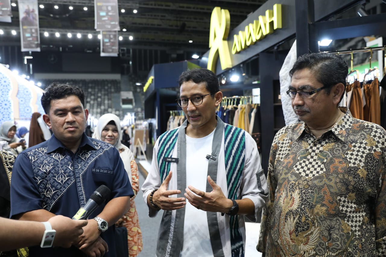 Menteri Pariwisata dan Ekonomi Kreatif (Menparekraf) Sandiaga Uno berkesempatan mengunjungi both Aneuk Muda Aceh Unggul Hebat (AMANAH) yang hadir di Muslim Fashion Festival (Muffest) 2024. (Istimewa)