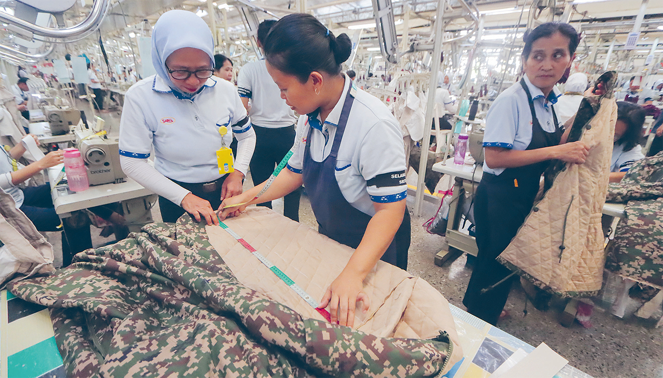 TETAP BEKERJA: Aktivitas produksi jaket di PT Sritex, Sukoharjo, Jawa Tengah, Senin (28/10). Kendati dinyatakan pailit, proses produksi masih berjalan 24 jam. (M IHSAN/JAWA POS RADAR SOLO)