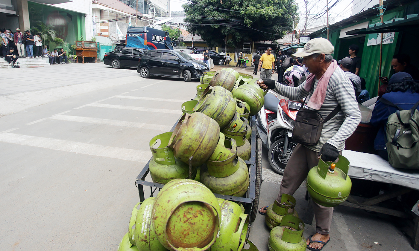 Pedagang eceran bongkar muat tabung LPG (Liquefied Petroleum Gas) 3 Kg atau gas melon di Jakarta.