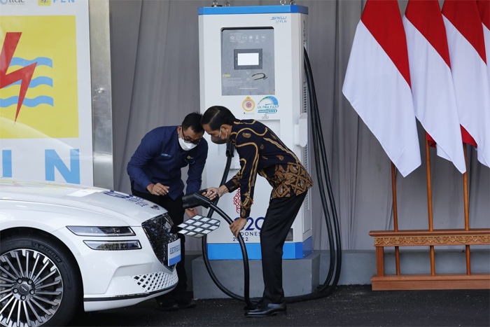 Ilustrasi Presiden Joko Widodo bersama Direktur Utama PT PLN (Persero) Darmawan Prasodjo menguji coba mengisian baterai mobil listrik. (Foto: PN untuk JawaPos.com)