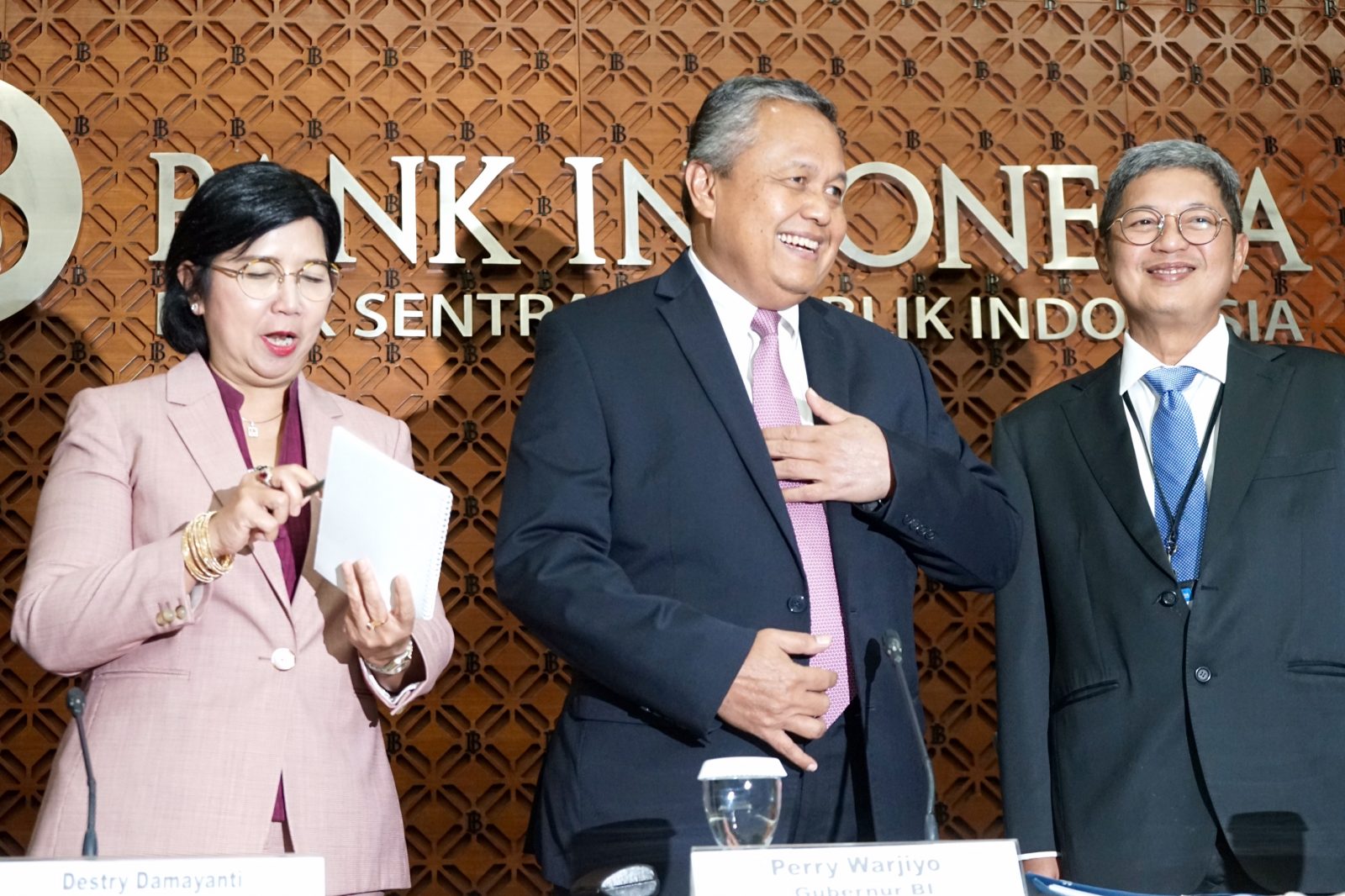 Gubernur Bank Indonesia (BI) Perry Warjiyo (tengah) didampingi Deputi Gubernur Senior Destry Damayanti (kiri) dan Deputi Gubernur Erwin Rijanto (kanan).