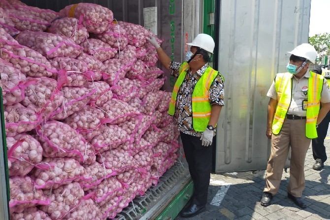 Direktorat Jenderal (Dirjen) Hortikultura Kementan Prihasto Setyanto ketika memantau kedatangan bawang putih impor di Balai Karantina Tanjung Perak, Surabaya.