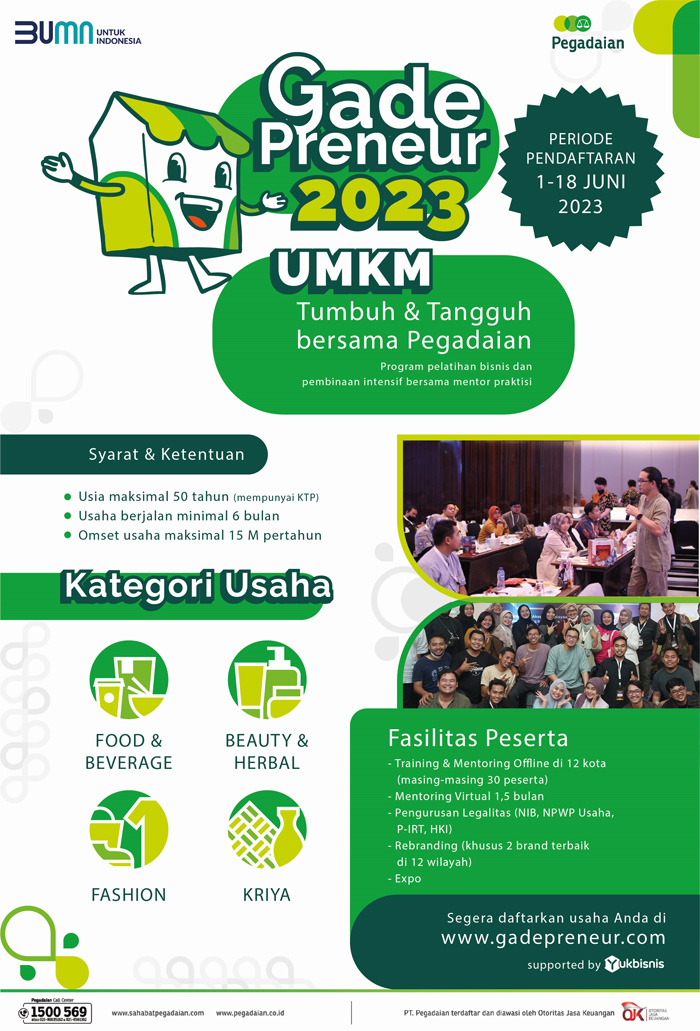 JawaPos.com - PT Pegadaian menggelar pelatihan dan pengembangan UMKM secara nasional sebagai bentuk dukungan terhadap program pemerintah dalam mengembangkan dan meningkatkan kompetensi UMKM. GadePreneur merupakan program pelatihan dan pengembangan UMKM yang dibentuk Pegadaian untuk Nasabah, Agen, Mitra Bisnis dan Masyarakat Umum yang ingin mengembangkan dan meningkatkan kompetensi kewirausahaan.