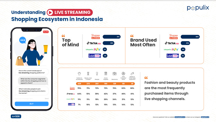 Populix baru-baru ini juga meluncurkan laporan “Understanding Live Streaming Shopping Ecosystem in Indonesia”. Laporan ini membahas tentang perilaku dan sikap pengguna terhadap live streaming ketika berinteraksi dan berbelanja melalui live streaming agar dapat memaksimalkan strategi dan mempelajari hambatan yang ada.
