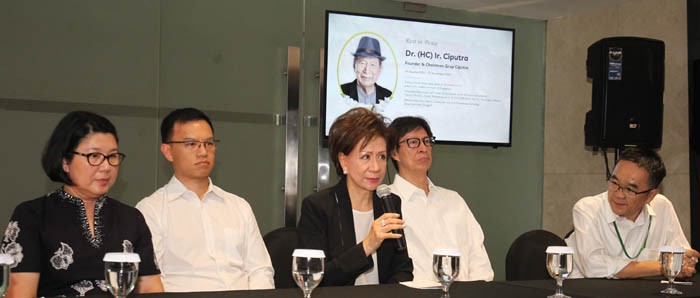 Dari Kiri ke kanan, Nanik J. Santoso (Senior Director Ciputra Group) ,Nararya Ciputra Sastrawinata (Direktur Ciputra Group), Rina Ciputra Sastrawinata (Managing Director Ciputra Group), Cakra Ciputra (Managing Director Ciputra Group), dan Tanan Herwandi Antonius (Senior Director Ciputra Group) saat memberikan keterangan terkait meninggalnya Dr. (HC) Ir. Ciputra di Lotte avenue, Jakarta, Kamis (28/11). (HARITSAH ALMUDATSIR/JAWA POS)
