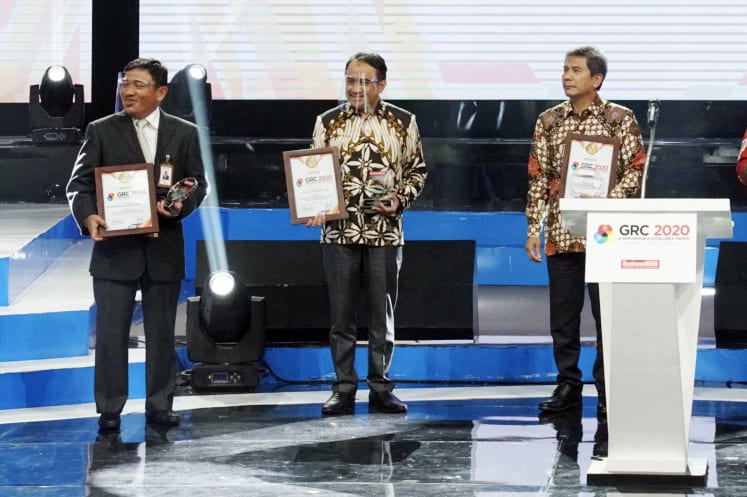 Direktur Kepatuhan dan SDM Bank Mandiri Agus Dwi Handaya (tengah) menunjukkan penghargaan The Best GRC Overall For Corporate Governance & Performance 2020 di Jakarta, Selasa (29/7).  (Bank Mandiri for JawaPos.com) - Image