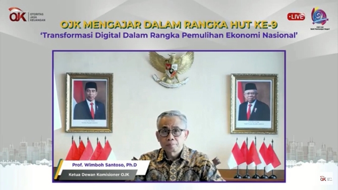 Ketua Dewan Komisioner Wimboh Santoso saat live streaming di YouTube Jasa Keuangan dalam acara OJK Mengajar “Transformasi Digital dalam rangka Pemulihan Ekonomi Nasional”, Kamis (19/11).