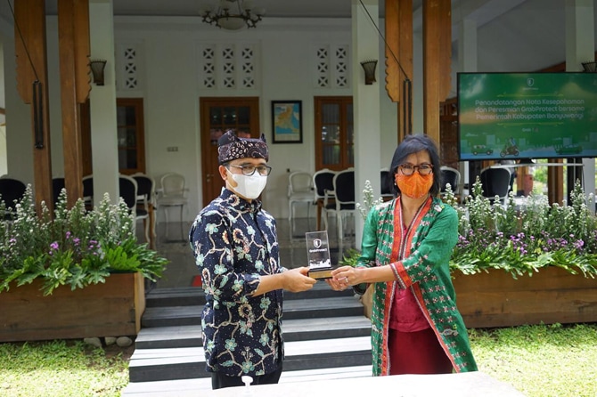 Bupati Banyuwangi H. Abdullah Azwar Anas, M.Si, dan Country Managing Director, Grab Indonesia, Neneng Goenadi seusia penandatanganan kerja sama startegis Grab dengan Pemkab Banyuwangi dalam mengembangkan ekonomi digital dan peluncuran layanan GrabProtect.