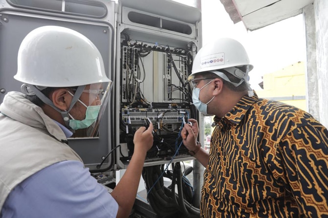 Chief Corporate Affairs XL Axiata, Marwan O. Baasir (kanan) bersama Kasubdit Penataan Spektrum Frekuensi Radio, Adis Alifiawan (kiri) meninjau proses uji coba Dynamic Spectrum Sharing (DSS) 4G/5G di Depok, Selasa (22/12).