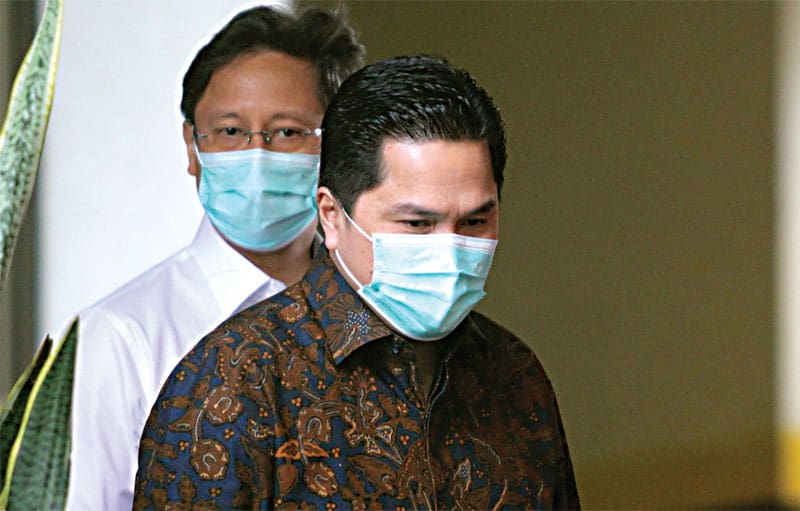 DISKUSI: Menteri BUMN Erick Thohir (kanan) dan Wakil Menteri BUMN Budi Gunadi keluar dari pintu belakang KPK, Jakarta, kemarin. (MUHAMAD ALI/JAWA POS)