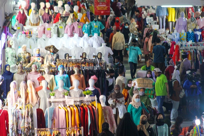 Sejumlah pengunjung mencari berbagai kebutuhan berupa pakaian di Pasar Tanah Abang, Jakarta, Jumat (30/4/2021). Pasar Tanah Abang kembali dipadati pengunjung. Mereka sengaja ke Tanah Abang untuk mencari baju baru menjelang Hari Raya Idulfitri 1442 Hijri