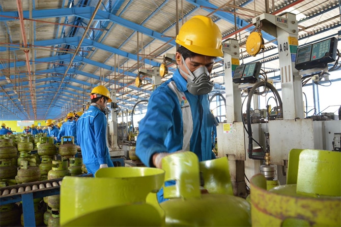 Ilustrasi pegawai PT Perrtamina tengah memeriksa pasokan tabung LPG. - Image