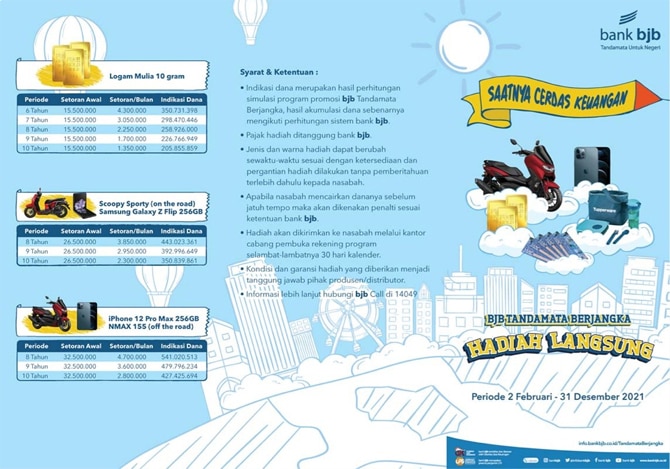 Periode promo ini berlaku dari tanggal 2 Februari sampai 31 Desember 2021. Pemberian hadiah langsung kepada nasabah yang membuka rekening bjb Tandamata Berjangka sesuai dengan jumlah setoran bulanan dan jangka waktu tertentu yang disertai dengan manfaat pertanggungan asuransi sesuai ketentuan bank.