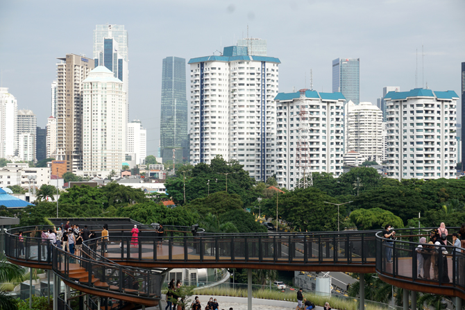 Warga menikmati suasana gedung bertingkat di kawasan Senayan Park, Selasa (28/12/2021). Menteri Keuangan Sri Mulyani Indrawati memproyeksikan pertumbuhan ekonomi domestik akan tumbuh di atas 5 persen pada kuartal IV/2021. Dia menyampaikan, pertumbuhan yan - Image