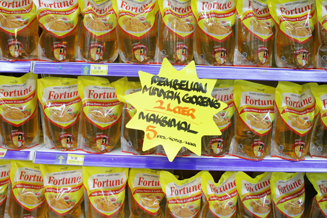 Pengunjung membeli minyak goreng kemasan di Pusat Perbelanjaan, Jakarta, Jumat (18/3/2022). Imbas Pemerintah mencabut kebijakan Harga Eceran Tertinggi (HET) minyak goreng berdampak pada daya beli masyarakat menurun karena melambungnya harga dipasaran diba