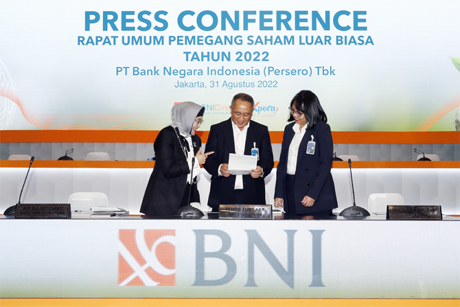 Direktur Utama BNI Royke Tumilaar (tengah), Wakil Direktur Utama BNI Adi Sulistyowati (kiri) Direktur Finance Novita Widya Anggraini (kanan) usai Rapat Umum Pemegang Saham Luar Biasa 2022 BNI di Menara BNI Pejompongan, Jakarta, Rabu (31/8/2022).