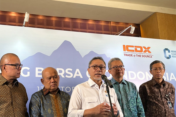 Menteri Perdagangan (Mendag) Zulkifli Hasan atau Zulhas (tengah) usai peluncuran Bursa CPO di Hotel Mulia Senayan, Jakarta Pusat, Jumat (13/10).