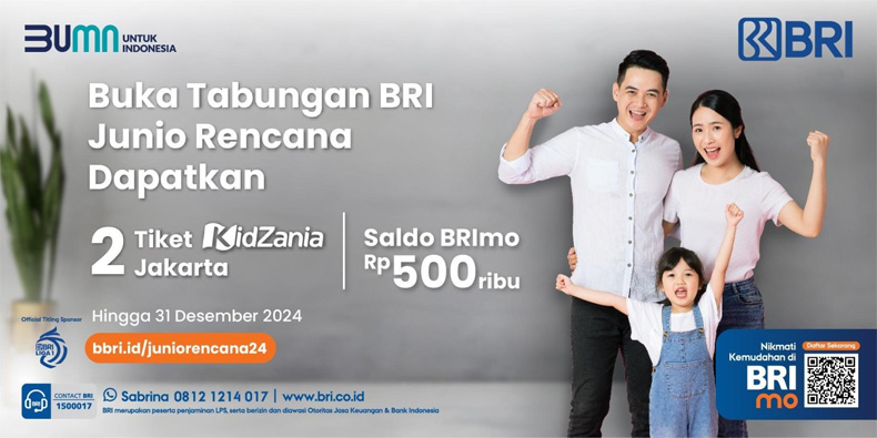Yuk segera buat Tabungan BRI Junio Rencana agar anak terbiasa menabung. Dapatkan pula reward menarik dari BRI. Info lebih lanjut kunjungi bbri.id/juniorencana24.