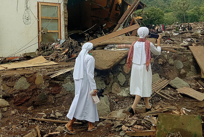 AKSES HANCUR: Dua biarawati melintasi rumah yang rusak berat setelah banjir bandang menghantam Lembata, NTT, kemarin (RICKO WAWO/AP PHOTO)