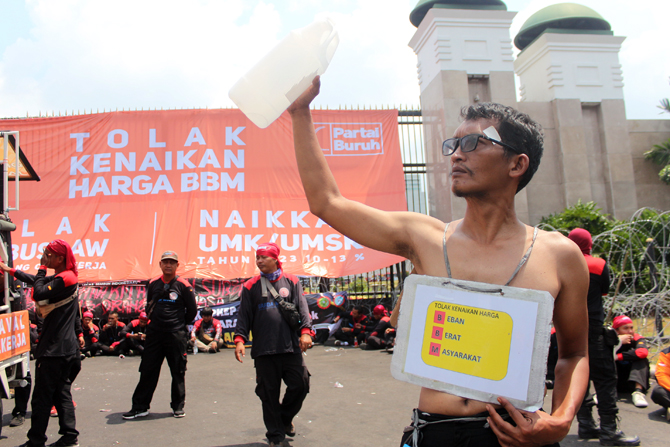 Ratusan buruh dari berbagai aliansi melakukan aksi demo menolak kenaikan harga BBM di depan Gedung DPR RI, Jakarta, Selasa (6/9/2022). Dalam aksinya mereka menuntut 3 tuntutan, yaitu menolak kenaikan harga BBM, menolak omnibus law UU Cipta Kerja, dan ken