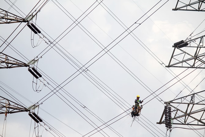 Petugas melakukan perawatan Saluran Udara Tegangan Ekstra Tinggi (SUTET) di Jalan KH Noer Ali, Bekasi, Kamis (26/11/2020). Perawatan dilakukan secara rutin untuk menjaga pasokan listrik tetap aman. Foto: Dery Ridwansah/ JawaPos.com