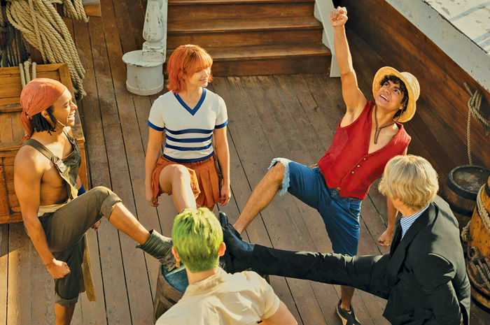 SIAP BERLAYAR: Searah jarum jam, Luffy (bertopi, diperankan Inaki Godoy), Sanji, Roronoa Zoro, Usopp, dan Nami dalam first trailer live-action One Piece yang dirilis di Tudum 2023.