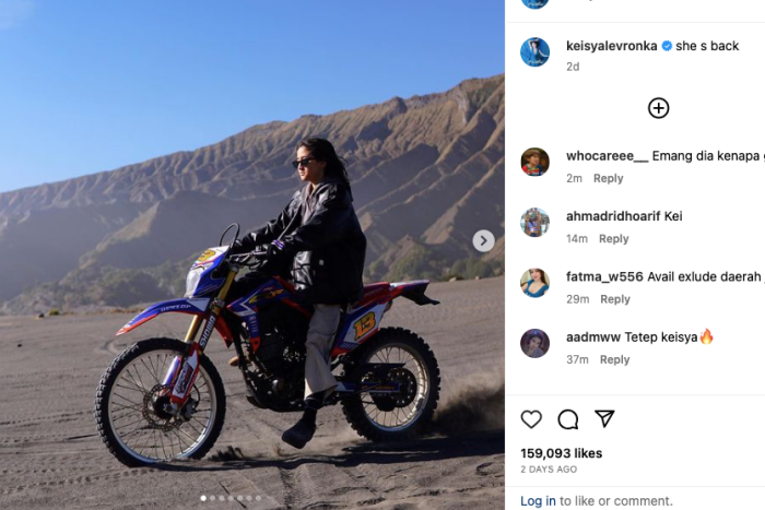 Kini, diketahui akun Instagram Keisya Levronka @keisyalevronka muncul kembali. Unggahan perdana akun tersebut memperlihatkan dirinya sedang mengendarai motor trail di kawasan gunung Bromo pada Rabu (16/8) kemarin.