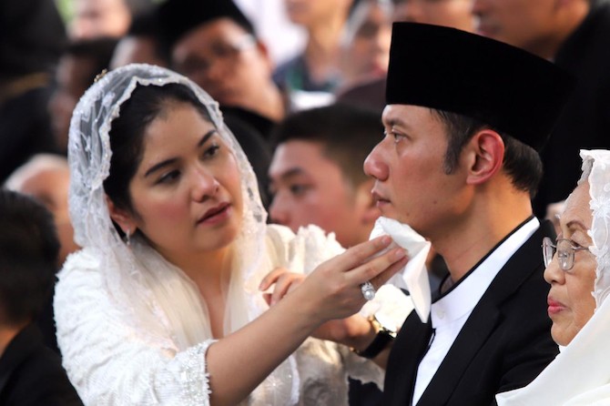 Annisa Pohan, menantu Ani Yudhoyono ketika menyeka air mata suaminya, Agus Harimurti Yudhoyono (AHY) pada saat prosesi pemakaman mertuanya. (Dery Ridwansah/JawaPos.com)