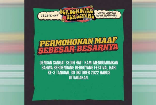 ”Dengan berat hati menginformasikan bahwa event festival pada hari ke-3 tanggal 30 Oktober 2022 yang diselenggarakan di Istora Senayan & Parkir Selatan GBK, harus dibatalkan atas dasar alasan keselamatan dan keamanan,” tulis akun Instagram Berdendang Bergoyang.
