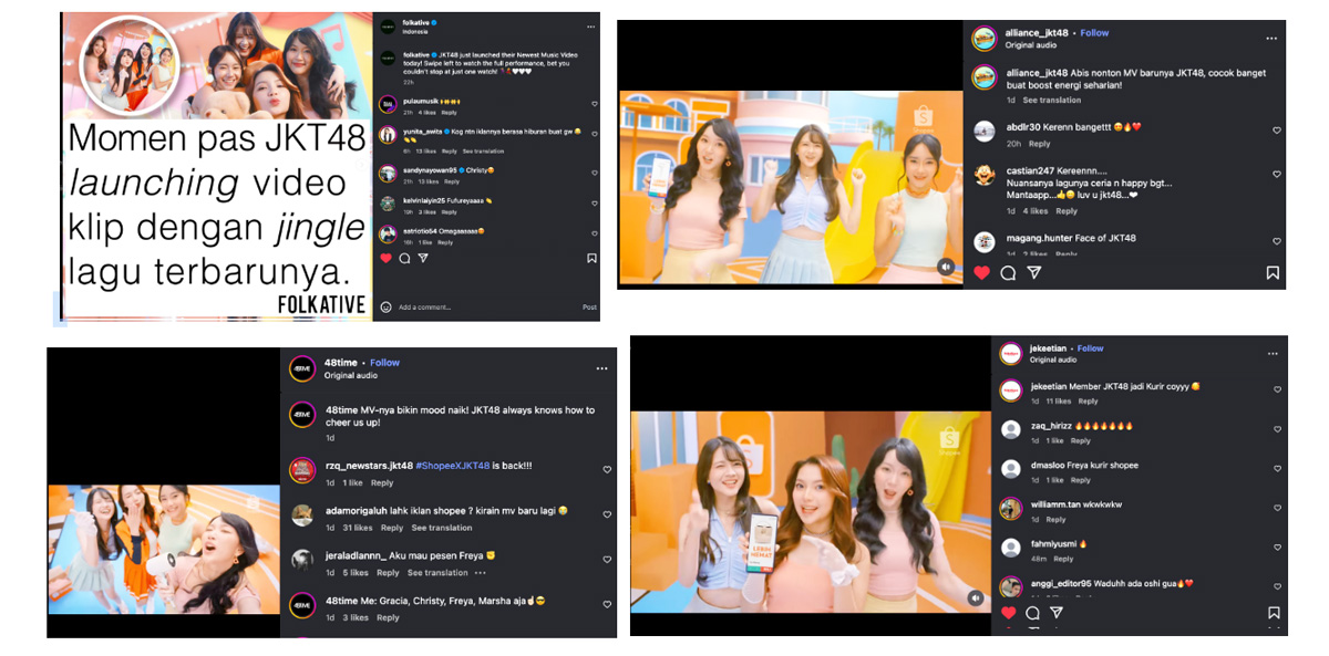 Bahkan akun fanbase JKT48, seperti @48time, @jekeetian, dan @alliance_jkt48 serta akun media digital seperti @folkative turut meramaikan euforia perilisan MV “Lebih Hemat, Lebih Cepat”. Mereka membagikan cuplikan video, memberikan dukungan, hingga mengajak followers untuk menonton dan merasakan semangat dari kolaborasi seru JKT48 x Shopee ini. Antusiasme ini semakin membuktikan bahwa jingle tersebut berhasil mencuri perhatian tidak hanya masyarakat, tetapi juga dari fans dan komunitas di media sosial.