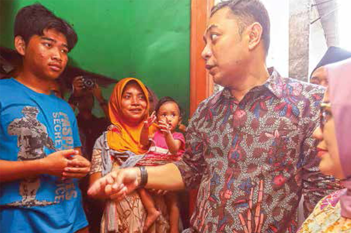 BERI BANTUAN: Wali Kota Surabaya Eri Cahyadi (dua dari kanan) didampingi Ketua TP PKK Surabaya Rini Indriyani saat mengunjungi rumah Choirul Anam di Bulak Rukem.