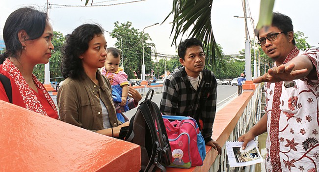 MENCARI JEJAK: Ana Maria van Keulen (kiri) bersama Kristi (dua dari kiri) di ujung Jembatan Jagir Wonokromo, Surabaya.