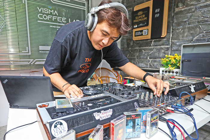 DJ PITA KASET: Faldi Allan Yoko Maru Posumah, penggiat music selector Surabaya, saat memainkan lagu-lagu lawas lewat kaset koleksinya di Visma Gallery beberapa waktu lalu.