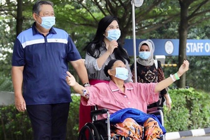 SEMPAT MEMBAIK: Susilo Bambang Yudhoyono bersama Annisa Pohan sedang menemani Ani Yudhoyono berjalan-jalan di sekitar rumah sakit National University Hospital (NUH). Foto ini diunggah pada 16 Mei di akun instagram Ani Yudhoyono. (Instagram @aniyudhoyono)