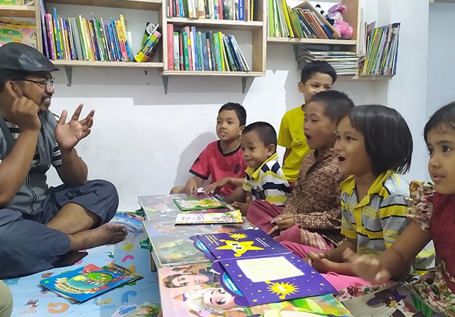 PENDIDIKAN DASAR: Handoko menemani anak-anak membaca buku serta mengenalkan dolanan lawas di Rumah Baca Handoko. (Hisyam/Jawa Pos)