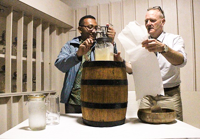 Domo melanjutkan penjelasannya langsung lewat praktik. Para awak media diajak masuk ke museum. Bergabung dengan para pengunjung museum. Sudah disiapkan meja lengkap dengan sejumlah peralatan. Ada tabung firkin dan stoples kaca berisi susu murni ditambah air. Stoples beling berukuran mirip tempat penyimpanan dawet itu memiliki tutup khusus berupa alat yang bisa mengaduk isi stoples. "Sekarang mari kita buat sendiri mentega, seperti pengalaman masa lalu itu," ajak dia.