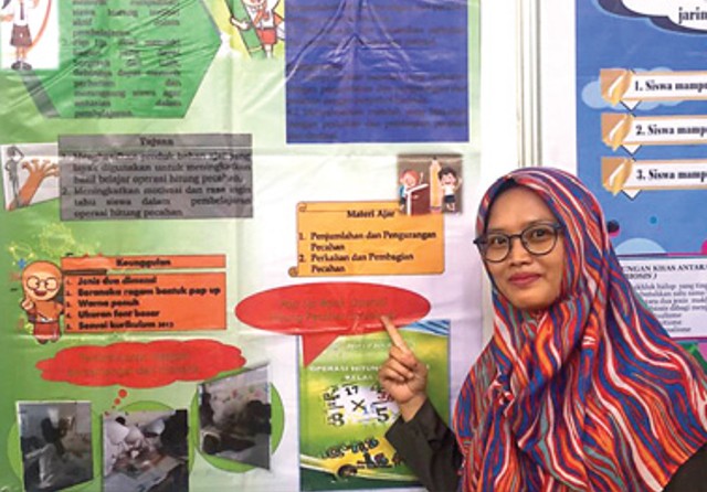 Bahan ajar yang dia buat seputar operasi hitung pecahan kelas V. ’’Mulai penjumlahan, pengurangan, perkalian, hingga pembagian pecahan,’’ tambahnya. Di dalam buku yang berbentuk A4 itu ada beragam origami yang memuat penjelasan tentang operasi hitung pecahan. ’’Saya juga beri font lebih besar. Tidak kecil seperti buku cetak kebanyakan,’’ tambahnya.