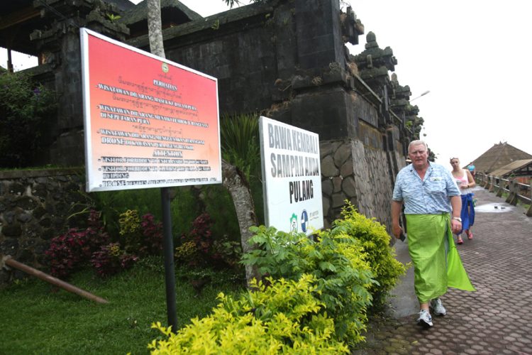 JAGA KEBERSIHAN: Papan peringatan untuk tidak meninggalkan sampah dipasang di Pura Besakih, Bali.