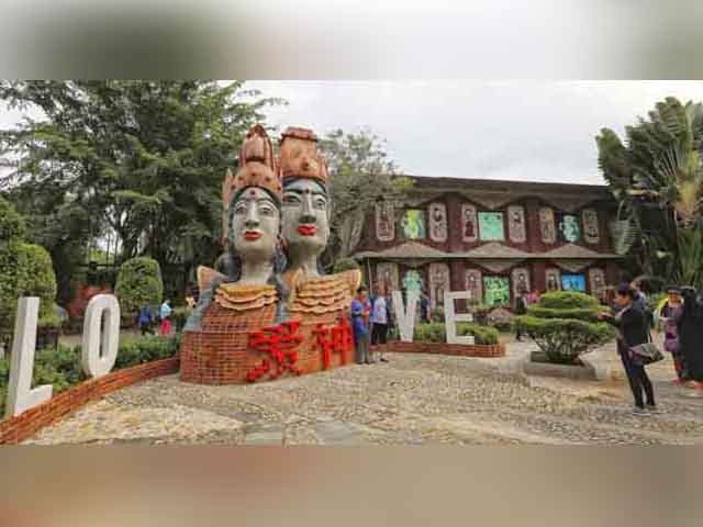 DUPLIKAT: Wisatawan berfoto di depan Desa Bali, di Xinlong, Hainan, Tiongkok mendatangkan seniman dari Bali untuk mengelola desa wisata wisata tersebut. (Puguh Sujiatmiko/Jawa Pos)