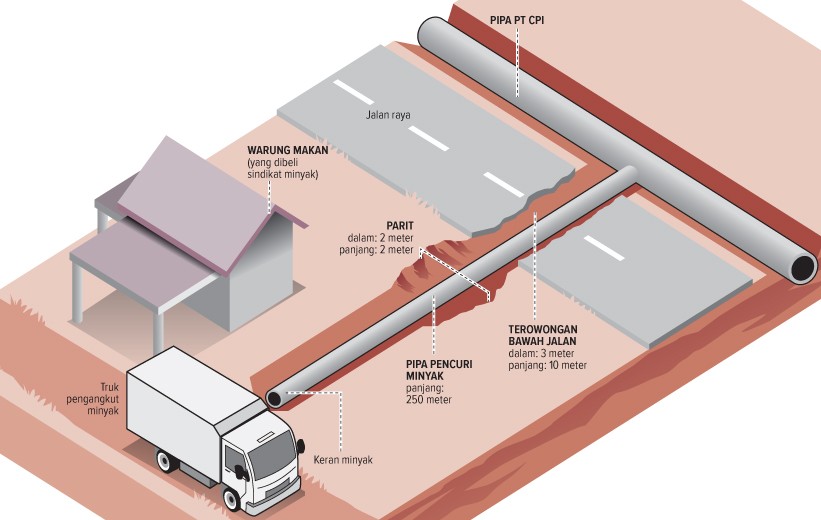 Salah satu titik pencurian berada di Tapung Hilir, Kampar, Riau. Modusnya, sindikat pencuri itu membeli warung makan di dekat lokasi target pencurian. ”Yang membeli adalah Daulat Panjaitan, salah seorang tersangka,” tuturnya. Mereka rela mengeluarkan Rp 50 juta untuk membeli warung tersebut pada 2018. Lalu, mereka menggali terowongan di belakang warung. Terowongan itu tersambung dengan pipa minyak milik PT CPI yang ada di seberang jalan.